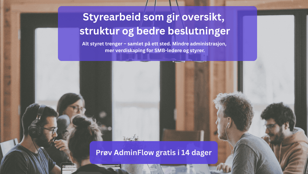 AdminFlow leverer norges beste kvalitetsysstem for regnskapsbyråer samtidig som vi gir kundene dine en kundeportal de sent vil glemme. Med styrearbeid, aksjonærregister, kontrakter, eSignering og due diligence i én sikker portal – laget for regnskapsbransjen og selskaper som vil jobbe smartere.