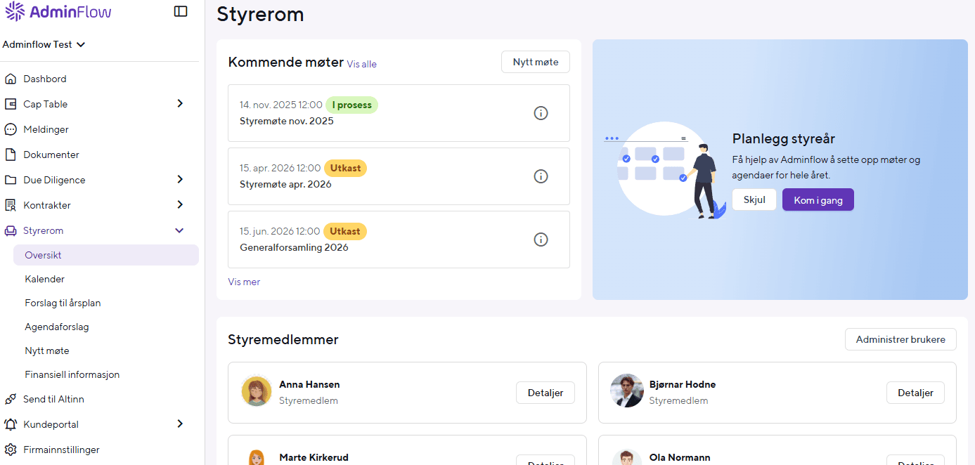 Fra styremøter til aksjonærregistre, kontraktsforvaltning til e-signering – AdminFlow er den komplette plattformen for styrer, aksjonærer og kundesamarbeid.